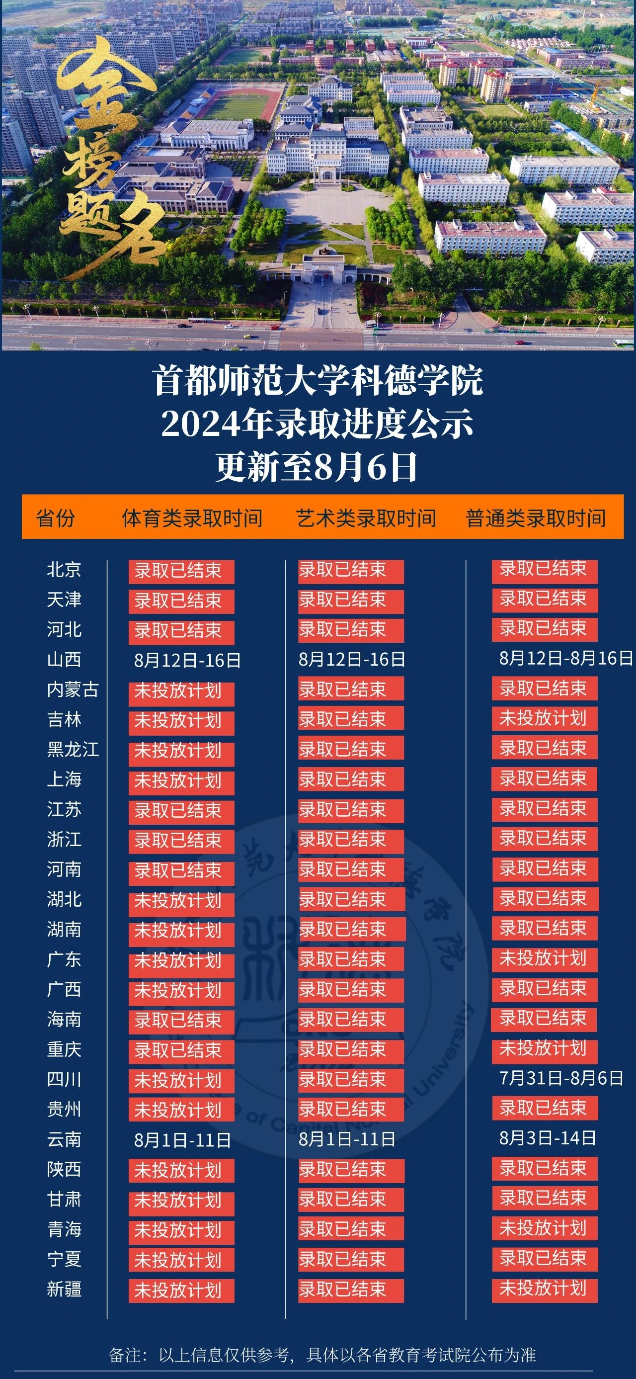 首都師范大學科德學院錄取進程公示(更新至2024年8月6日)