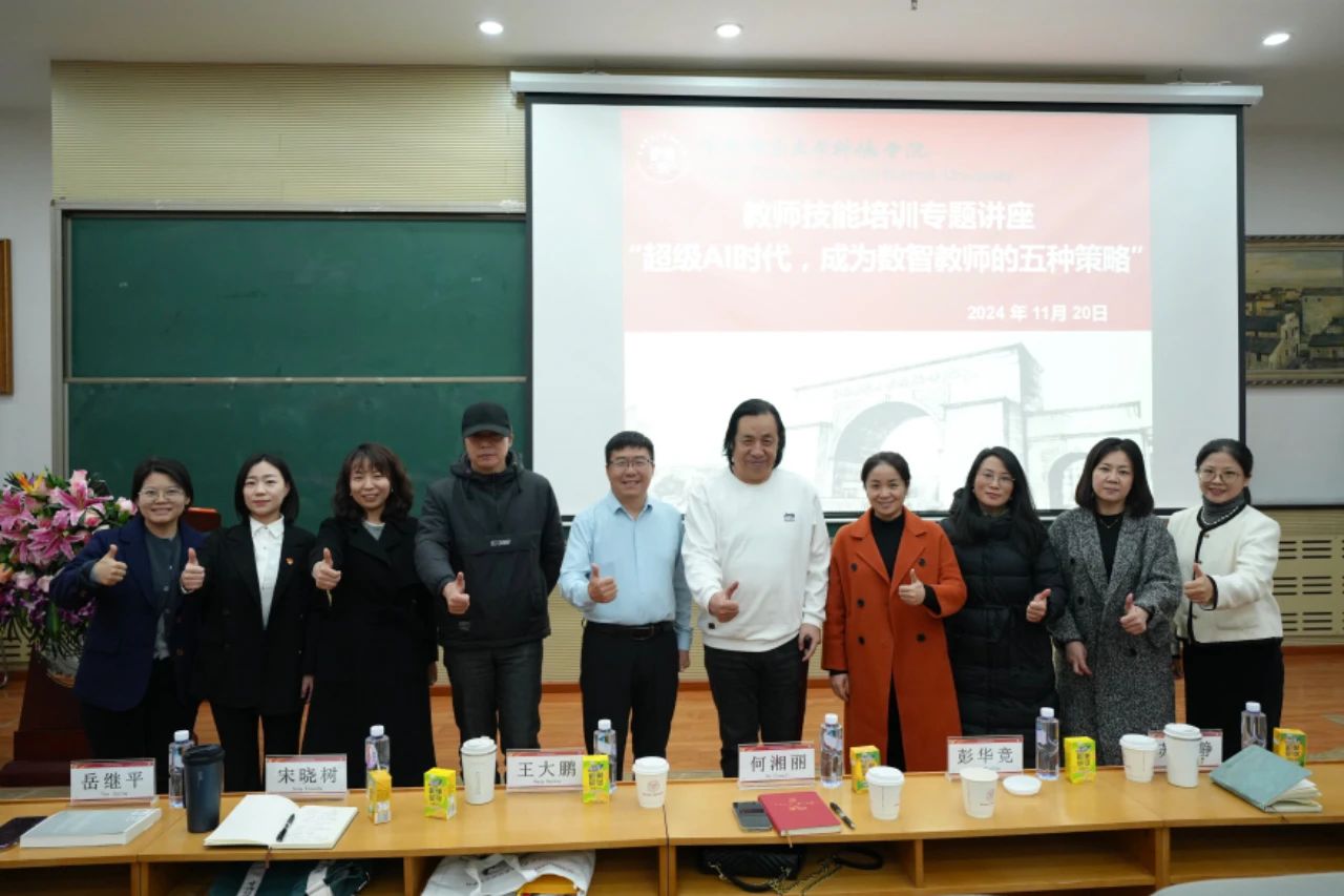 2024年11月20日13:00,首都師范大學科德學院于第一教學樓1111報告廳開展關于“超級AI時代成為數智教師的五種策略”主題講座。本次活動有幸邀請到了未來教育跨界研究者,《超級AI與未來教育》,《元宇宙教育》,《家庭教育心法》作者,中國教育三十人論壇特約研究員,清華美院社會美育研究所學術委員,中關村互聯網教育創新中心專家委員李駿翼老師作為主講人,何湘麗老師、宋曉樹老師共同參與。首都師范大學科德學院藝術設計學院院長彭華競、傳媒學院院長王大鵬、傳媒學院副院長岳繼平、藝術設計學院副院長趙芳、人文與社會科學學院副院長蘇靜出席。此次培訓由人事處、教務處、教師教學發展中心聯合舉辦,由學校辦公室副主任、人事處副處長支安寧主持。