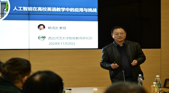 互聯網教育數據學習分析技術國家地方聯合工程實驗室副主任、中央電化教育館人工智能教育工作組組長楊鴻武教授做了題為“人工智能技術在英語教學中的應用與挑戰”的專題講座。