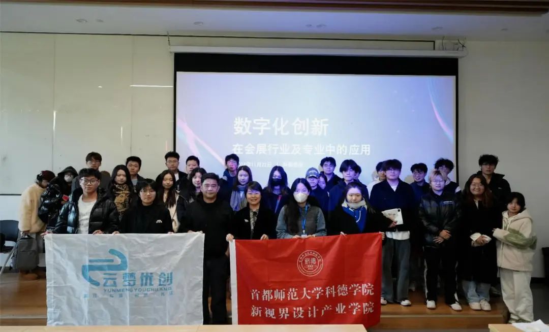 武君董事長憑借自身十八年的創業經驗,向學生們全面展示了數字化在行業及專業領域應用的細節。他構建了數實融合空間共創平臺,并將其應用于會展實踐教學和真實項目運作中。武君董事長的講座使學生們對當前軟件學習與未來數字化應用之間的聯系有了新的認識。活動圓滿結束后,工作室的學生們與武總及王芳老師一同合影留念,為此次活動留下了珍貴的回憶。