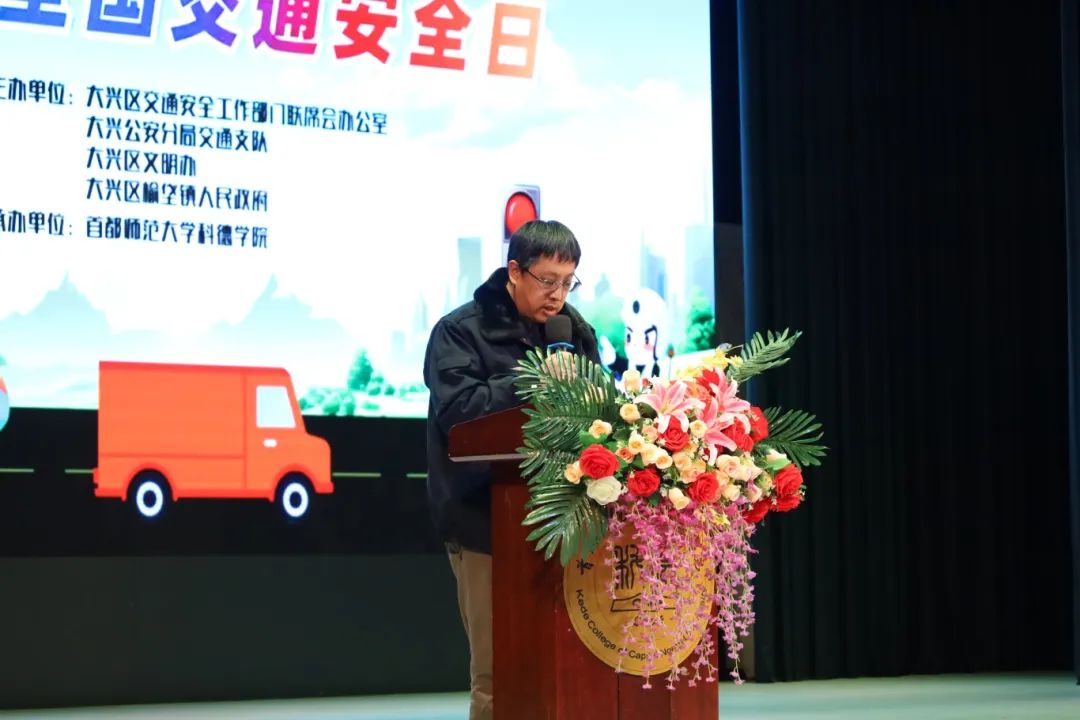本次活動由大興區交通安全工作部門聯席會辦公室、大興區文明辦、大興公安分局交通支隊與北京市大興區榆垡鎮人民政府聯合主辦,首都師范大學科德學院承辦。活動現場嘉賓匯聚,大興區交通支隊副支隊長宋海松,大興交通支隊高速路中隊指導員耿川,榆垡鎮人民政府黨委委員、武裝部部長王錚,教委主任李子學,綜治辦主任趙學鵬等鎮街領導,以及首都師范大學科德學院黨委副書記、副校長陳永俠等相關領導均蒞臨現場,科德學院的廣大師生亦踴躍參與。