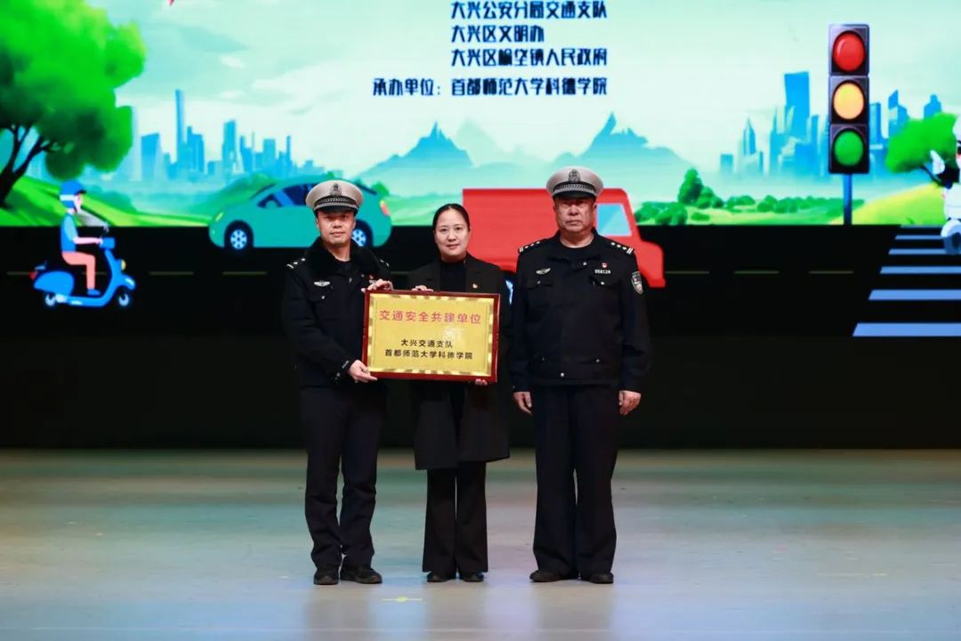 在莊重的氛圍中,大興區交通支隊副支隊長宋海松將牌匾分別授予了高速中隊指導員耿川和首都師范大學科德學院黨委副書記、副校長陳永俠。這一授牌儀式不僅標志著交通安全工作的責任得到了進一步的深化與傳承,同時也彰顯出各方將在交通安全這一關鍵領域承擔起更加艱巨且重要的使命。面對這一使命,所有參與者都將以更堅定的決心和實際行動,全力保障交通安全,共同營造一個更為安全、有序、順暢的交通環境,為大興區的交通安全長遠發展注入新的活力。