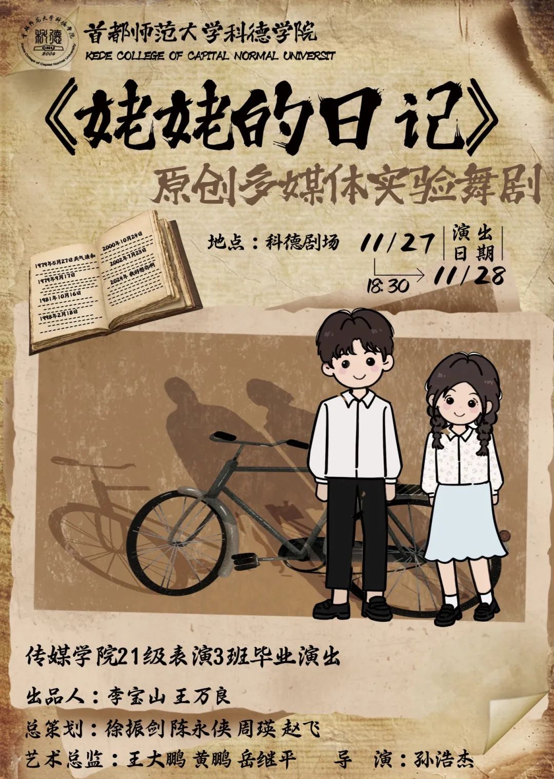 在2024年11月27日與28日18:30,首都師范大學科德學院劇場內,一場畢業大戲隆重啟幕。劇場內座無虛席,首都師范大學科德學院副校長周瑛、傳媒學院院長王大鵬、傳媒學院黨支部書記黃鵬蒞臨現場,眾多科德學院的師生們滿懷熱忱地齊聚于此,共同見證畢業大戲的精彩呈現,感受校園藝術文化的獨特魅力與濃厚氛圍。