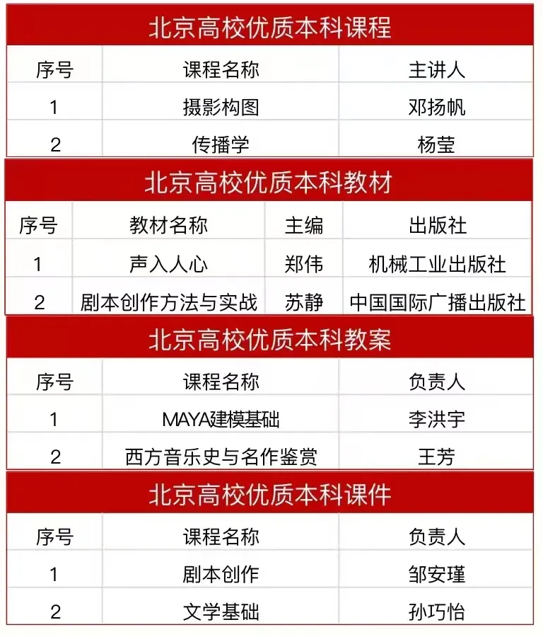 11月,在北京高校本科教學(xué)項(xiàng)目評(píng)選中,榮獲多個(gè)獎(jiǎng)項(xiàng),教學(xué)成果豐碩。《攝影構(gòu)圖》課程與《傳播學(xué)》課程獲批“北京高校優(yōu)質(zhì)本科課程”;《聲入人心》教材與《劇本創(chuàng)作方法與實(shí)戰(zhàn)》教材獲批“優(yōu)質(zhì)本科教材”;《MAYA建模基礎(chǔ)》教案與《西方音樂史與名作鑒賞》教案獲批“優(yōu)質(zhì)本科教案”;《劇本創(chuàng)作》課件與《文學(xué)基礎(chǔ)》課件獲批“優(yōu)質(zhì)本科課件”。這是學(xué)校教育優(yōu)勢特色、教學(xué)成效的體現(xiàn),是對(duì)學(xué)校努力進(jìn)行教育教學(xué)改革的不斷探索和實(shí)踐的肯定。