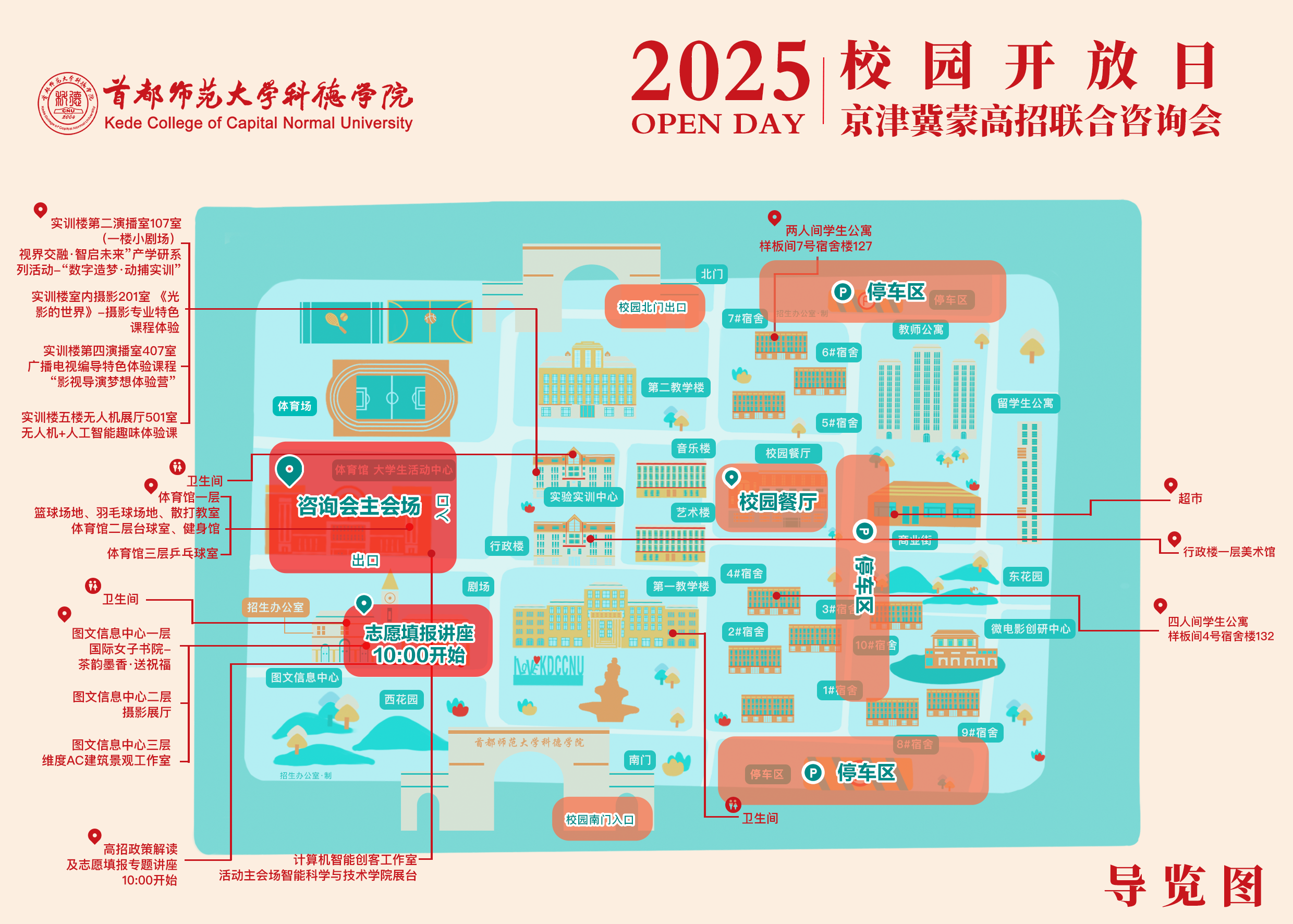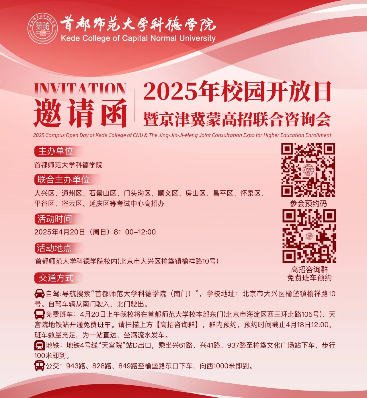 因受天氣影響,原定于4月12日舉辦的“首都師范大學科德學院2025年校園開放日暨京津冀蒙高招聯合咨詢會”延期至4月20日(本周日)舉辦。以下是本次活動的具體安排: