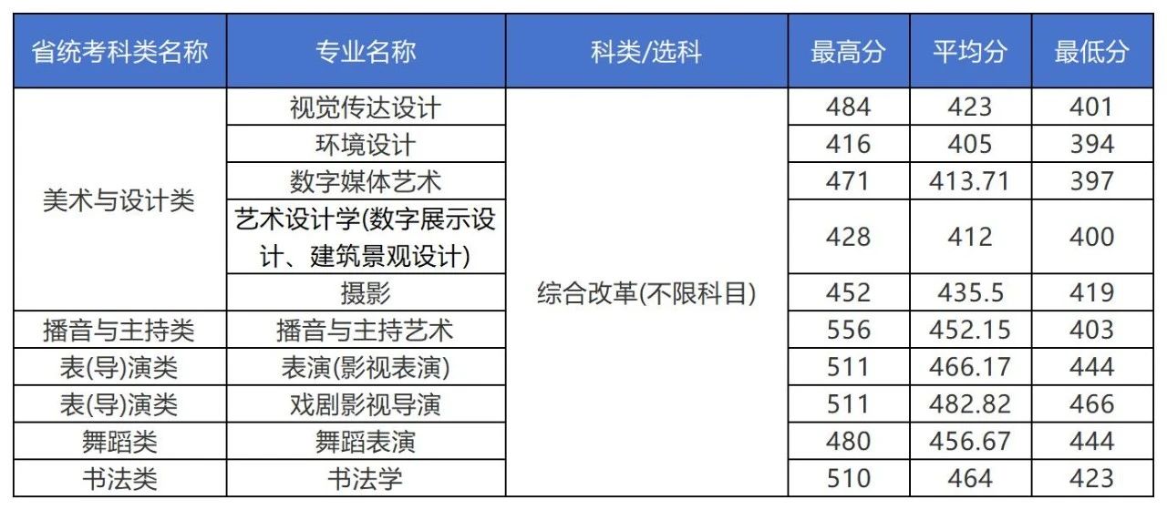 數字媒體藝術、視覺傳達設計、環境設計、藝術設計學、攝影、播音與主持藝術、戲劇影視導演、表演(影視表演)、舞蹈表演、書法學。