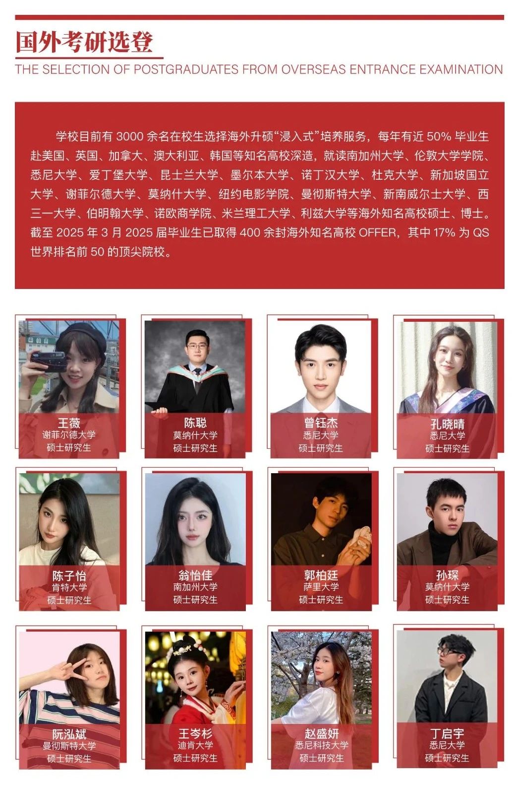 我校2025年所有本科專業均開通海外升碩“浸入式”培養服務,2025級全體新生均可報名。學校同美國、英國、加拿大、澳大利亞等全球10多個國家百余所海外知名高校建立合作關系,打通與國外知名高校的溝通渠道,專注于為我們的在校生提供更多海外升碩的可能性,旨在留學生涯規劃,雅思分層學習,導師全程指導等助力學生牽手世界名校,實現“國內本科+國外碩士”的無縫直通。