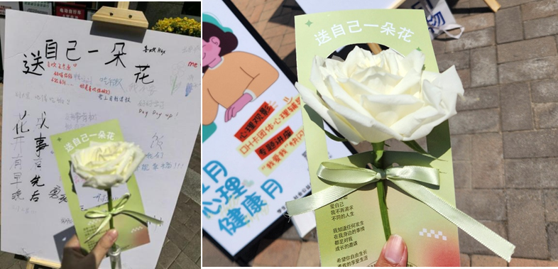 在“我愛我?送自己一朵花” 鮮花快閃活動中,同學們收獲了屬于自己的驚喜鮮花和手寫寄語。