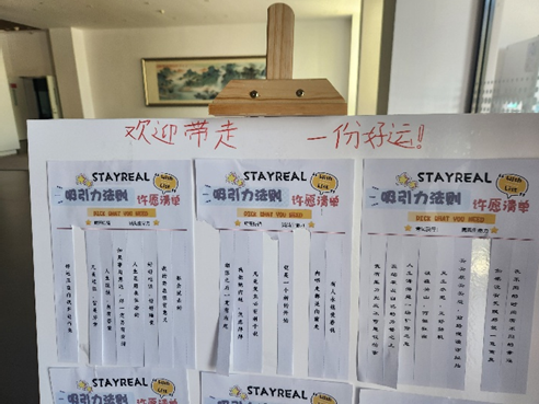 為了幫助學生積極迎接考試周帶來的學業壓力,心理健康中心布置了“吸引力法則展臺”,上百張寫有高能量語句的卡片靜候著與“命中注定”的同學相遇。讓自我激勵的力量從文字傳遞,在校園中悄然生發。